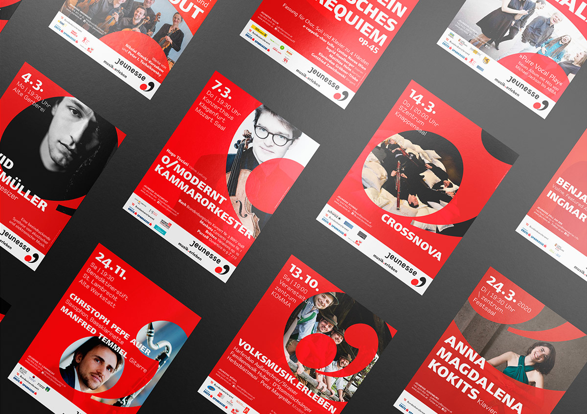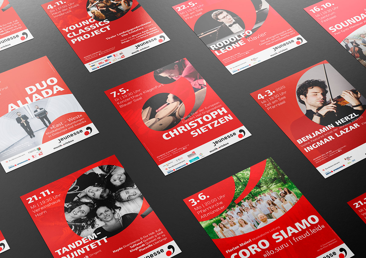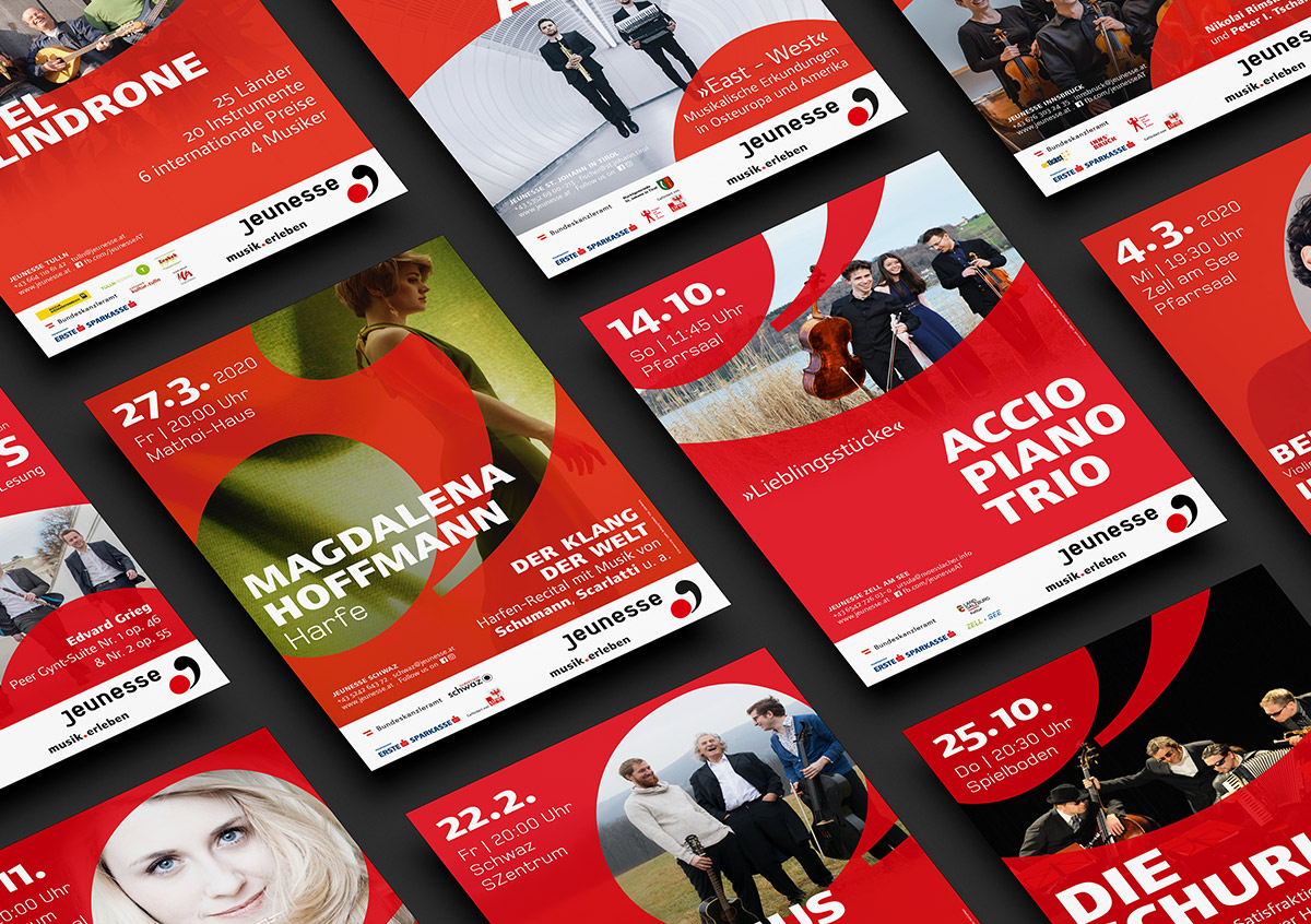 Für den Konzertveranstalter Jeunesse – Musikalische Jugend Österreichs haben wir ein Plakatsystem erarbeitet, welches durch den Einsatz einer Maske den Umgang mit den unterschiedlichen Qualitäten von Künstlerfotos erleichtert. Durch die feste Verortung von Informationen und dem Rot der Maske entsteht ein serieller Charakter, der durch die freie Platzierung von Headline und Maskenausschnitt jedoch wieder etwas aufgelockert wird. So geht das einzelne Konzert nicht in der Masse untergeht und kann den jeweiligen Schwerpunkt des Konzertes prominent in den Vordergrund rücken.