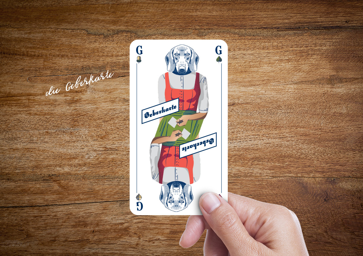Diese zusätzliche Bildkarte – mit dem Schriftzug GEBERKARTE – wird nicht direkt im Spiel verwendet, sondern bleibt offen am Tisch liegen. Und zwar immer bei demjenigen der in dieser Runde gerade die Karten gibt bzw. gegeben hat. Und nach jedem Spiel wird sie um einen Spieler weitergerückt. Damit auch nach dem X. Bier niemand mehr fragt: „Bin i dro mit gebn?“